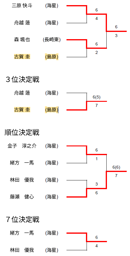 【結果/高校生】『令和7年度長崎県高等学校テニス選手権シングルス大会』の結果について ※ 今大会は【長崎県高体連テニス専門部】主催です。結果の詳細等は こちら からも確認できます! 令和7年9月13日(土)・14日(日) 『令和7年度(第37回)長崎県高等学校テニス選手権シングルス大会』が長崎県内3会場で開催されました。島原市内高校の結果については下記のとおり。 ―――情報提供があったので、遅れてでも掲載っ!!!! 【男子シングルス】 第3位 古賀 圭(島原高校) 【女子シングルス】 (結果 こちら) ―――さぁ、青春を謳歌しよう! (上位入賞おめでとう!) 島原市テニス協会